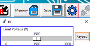 In the displayed dialogue box, you can define a maximal voltage using the slider(blue rectangle), or the numerical keypad (orange rectangle). Then click on OK to close the option dialogue box.